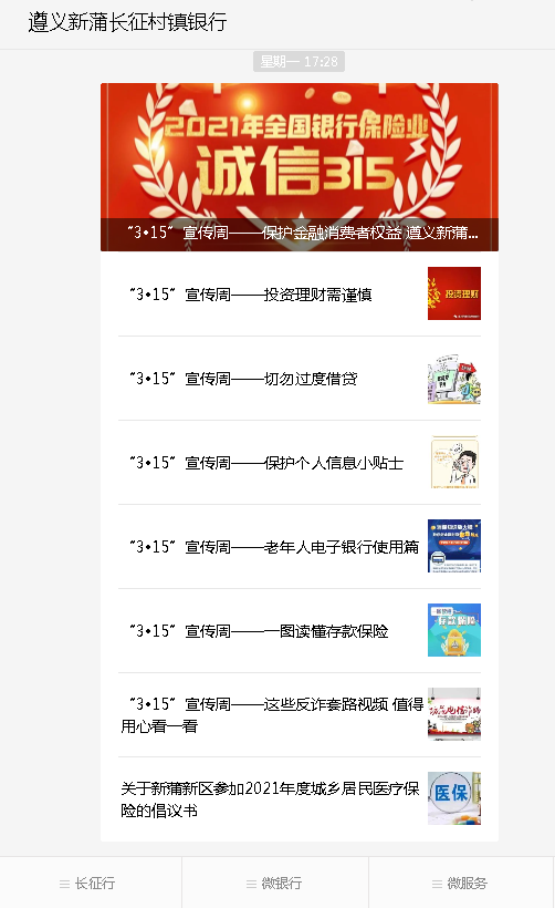 为积极做好金融消费者权益保护公众服务工作,构建和谐的金融环境,按照各级监管部门关于做好2020年3.15银行业消费者权益保护宣传周活动的有关要求,在2021年“3.15”金融消费者权益保护宣传周期间,遵义新蒲长征村镇银行组织辖内各支行开展了多种形式的宣传教育活动,积极保障和维护金融消费者合法权益。