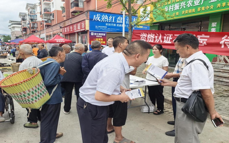近日,湄潭农商银行联合湄潭县社保局、复兴镇人民政府公共事务管理办公室,在复兴镇农贸市场开展联合宣传活动。