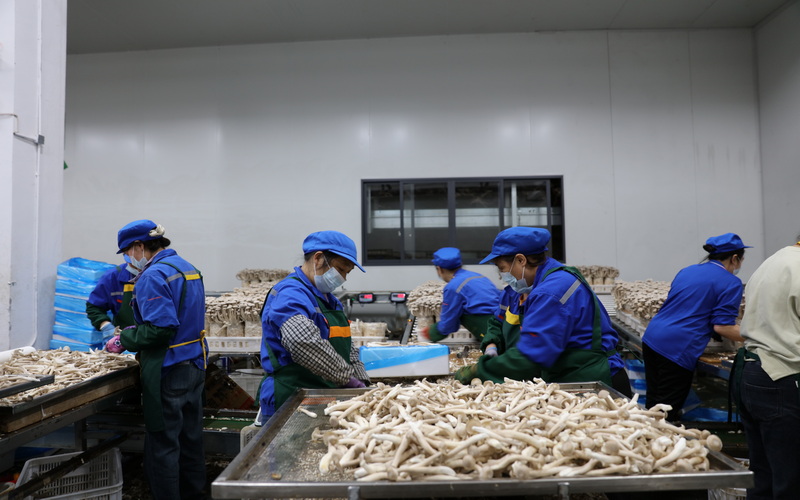 立冬过后,气温渐降,寒意渐浓。走进位于道真自治县的贵州贵旺生物科技有限公司,近100间“立体墙式”食用菌菇房排列规整。恒温调控的菇房内,杏鲍菇密集生长、长势喜人,工人们正有条不紊地将新鲜采收的杏鲍菇装入筐中。在二期生产厂区,各类成熟菌菇经自动输送带输送至包装车间,经人工分拣、剥离、分装,规范装箱后完成入库。所有成品菌菇将通过冷链物流体系,发往国内各大市场。