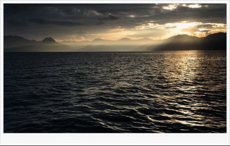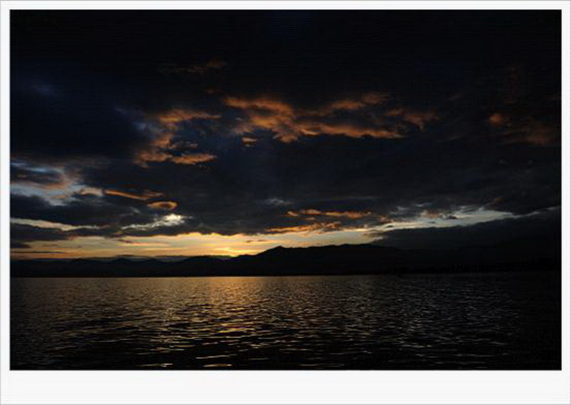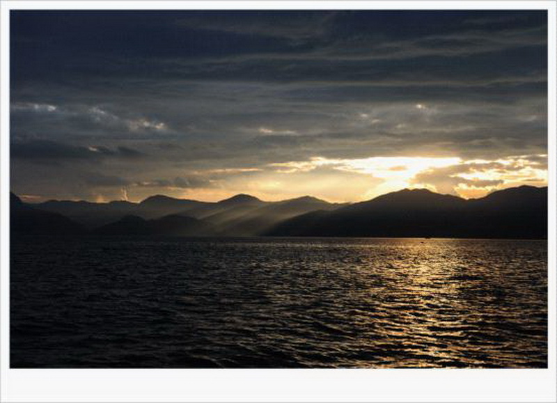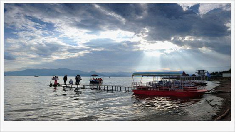 大家在岸边拍了一阵,坐船下湖,湖面上的景色在天空和阳光的配合下尽展不断变化之能事,转瞬之间,千变万化,阳光时而在云层的缝隙中透出,一会儿给周围的山峦披上轻纱,一会儿又给神秘的湖面戴上面纱,湖光山色,如梦如幻,让人目不暇接。耳边尽是不断的惊呼和赞叹之声,随即是一阵阵悦耳的“咔嚓”快门之音。
