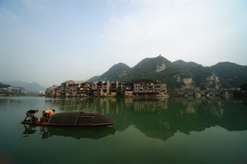 次日清晨,放眼望去,古镇给人的感觉就是江南水乡和贵州山区的完美结合。静静的走在舞阳河边,舞阳河赋予了镇远城无比的灵秀之气,修在崖壁上的古道观默默的守护着穿城而过的舞阳河,河面波平如镜,一只乌篷小船从渐渐从远处划来,你能感觉到江南水乡那种水墨国画般清新和细腻,古镇背后雄浑的高山和山脚古板街道及高墙却让人感到了古镇丰厚的历史文化底蕴……