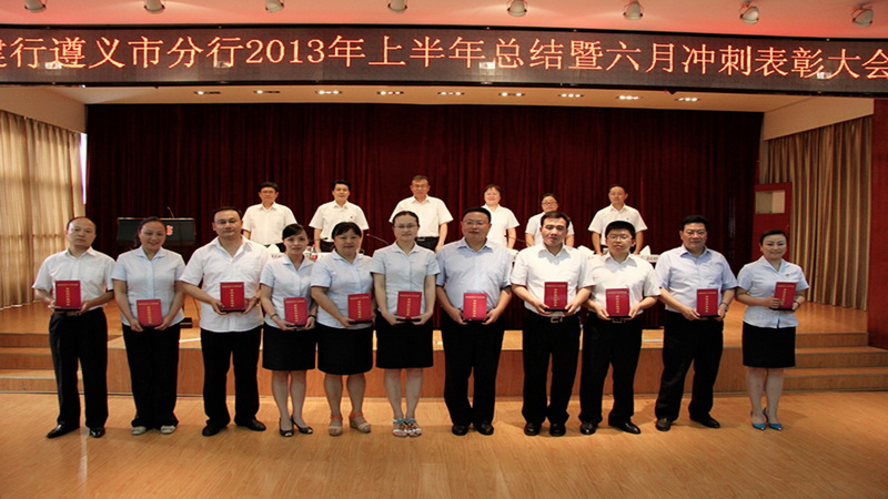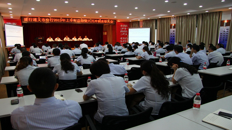 2013年7月12日下午16时30分,建行遵义市分行四届二次职工(会员)代表大会暨半年总结六月冲刺表彰会议在市分行十楼会议室胜利召开。市分行全体行领导出席,各县(市)支行、城区支行主要负责人、市分行各部门助理(含)以上负责人、城区各网点经理、职工(会员)代表、市分行部门行政序列副经理(含)以上以及专业技术五级(含)以上客户经理参加。会议由市分行张玉副行长主持。
