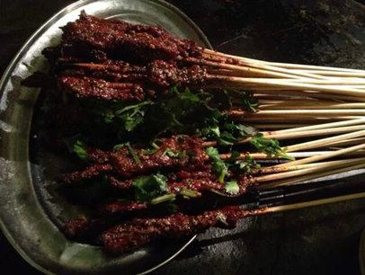 然后就是在离牡丹肠旺粉家不远的一个烧烤摊,他家老板姓杨戴着眼镜,所以都叫他家为杨眼镜。杨眼镜家的主打是烤羊肉串。挑选全瘦的羊肉腌制后在炭火上猛火烤,烤好后撒点芝麻和香菜。这种肉串的味道绝对是你在其他地方吃不到的!