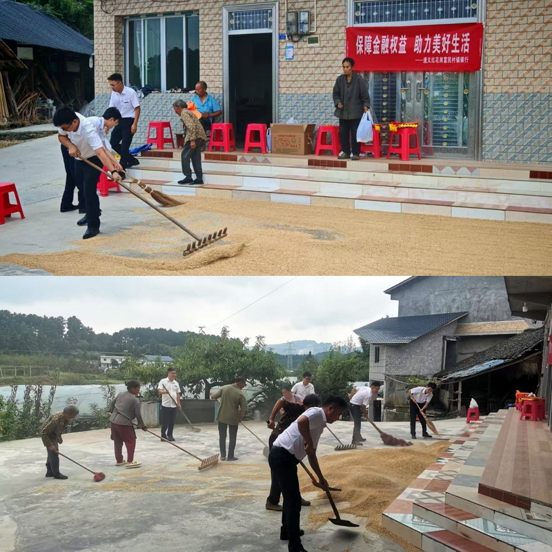 九月天如孩儿面,说变就变。活动途中忽然飘起细雨,而此时杜大哥家的院子里晒满了稻谷。杜大哥因腰伤收粮动作吃力,我行员工毫不犹豫放下手中的宣传资料,迅速上前帮忙。大家深知,稻谷是村民辛勤劳动的结晶,一旦被雨淋湿,反复晾晒不仅费时,更会影响收成。于是,你推我扫、你收我抬,紧张却有序。不少村民见状也纷纷加入,共同抢收稻谷。那一刻,我行员工与村民之间不仅是金融服务的关系,更成为了心贴心的亲人。