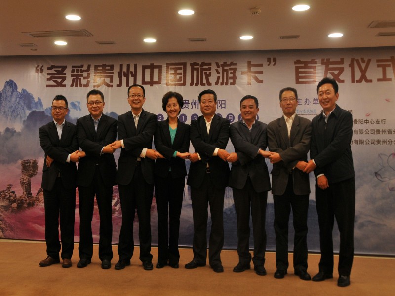 11月8日,在省金融办的大力支持下,由贵州省旅游局、中国银行贵州省分行、中国人民银行贵阳中心支行、中国银联股份有限公司贵州分公司联合主办的 “多彩贵州中国旅游卡”首发仪式在中国银行贵州省分行举行。省旅游局傅迎春局长、中国人民银行贵阳中心支行王平行长、中国银行股份有限公司贵州省分行贾天兵行长、中国银联贵州分公司徐承彦总经理等出席了首发仪式。