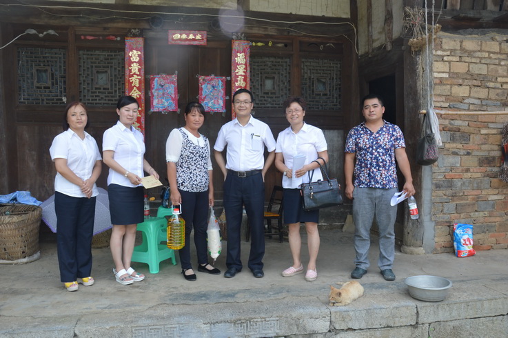 根据遵义县委、县政府印发的《遵义县干部遍访贫困村贫困户结亲“五带十帮”工作方案》部署,遵义县西坪镇茶园村民组是我支行精准扶贫的帮扶对口村,7月24日,遵义县支行行长任天丽、行长助理吴晨一行9人,在当地政府和村负责人的引领下,分两组到12家贫困户家中,进行调查访谈,进一步了解到我县农村中38(妇女)、61(留守儿童)、90(空巢老人)的生活现状,看到他(她)们或由于缺乏主要劳动力,或缺乏教育,或因病、因残疾等致贫,家徒四壁,生活在最底层。为了更好的实施精准扶贫、精准脱贫、强力推进扶贫攻坚战,努力实现同步小康,充分表达邮储银行有大爱,我们对每位帮扶结对的家庭送去了一袋米、一桶食用油、一份慰问金,鼓励他(她)们相信政府,在好政策的引领下,在全社会的关爱支持下,通过自身积极努力,脱贫致富奔小康。东西和钱虽然不多,饱含的是邮储银行员工的一颗颗爱心。